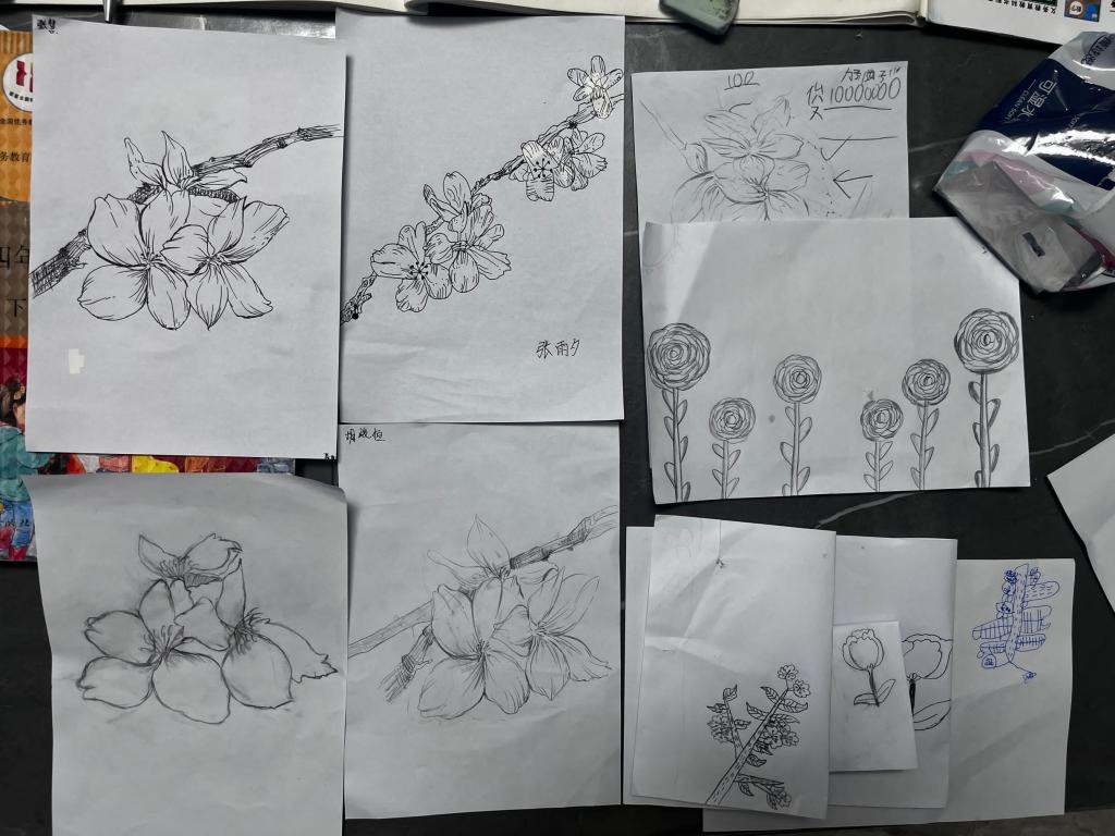 课程开始,小先生利用多媒体课件展示盆栽花卉,采用谈话法让小学员们谈谈对花卉的认识和理解,小学员们认真欣赏,并积极回答了有关花卉种类的提问。随后小先生引导学员欣赏与花相关的若干美术作品,让他们理解同一题材有多种绘画表现形式。线造型是绘画最基本的表现形式,小先生引导学员观察盆栽花卉,分析花瓣叶子的形状和组合规律、枝干的穿插规律,采用演示法让员工掌握线描写生的方法及要领。小先生特别强调观察的整体性和用线的流畅性,在写生过程中让小学员精准把握写生对象的特征,有目的地进行取舍。