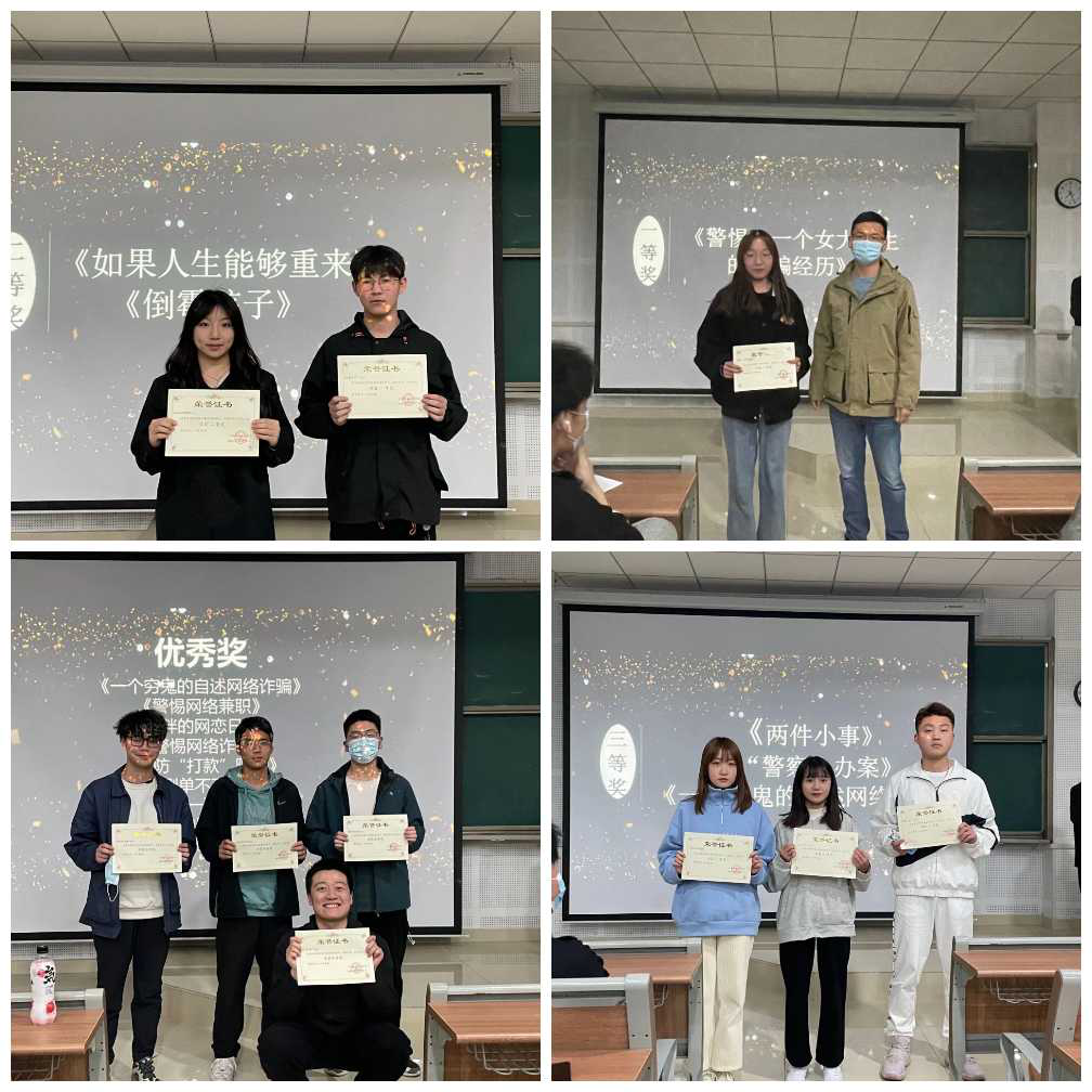 本次比赛中,作品《警惕!一个女老员工的被骗经历》荣获一等奖,作品《如果人生能够重来》、《倒霉孩子》获得二等奖,作品《两件小事》、《“警察”办案》、《一个穷鬼的自述网络诈骗》获得三等奖,还有《警惕网络兼职》、《小胖的网恋日记》、《警惕网络诈骗》等作品获得优秀奖。