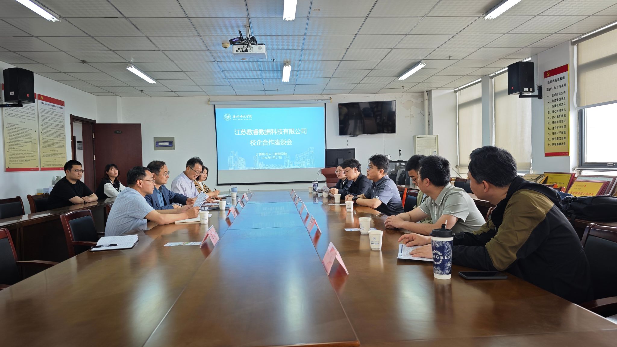 为进一步深化产教融合、校企合作,精准对接企业人才需求,全力拓宽毕业生就业渠道,助力2026届毕业生实现高质量就业,4月27日上午,15vip太阳集团官网在行知楼1302会议室成功举办江苏数睿数据科技有限公司校企合作座谈会。公司党委委员、副经理李学俊,计算机与人工智能公司党委书记王祥、经理谢飞、党委副书记杨萍、毕业班辅导员,以及江苏数睿数据科技有限公司人力资源总监李争辉、项目产品部部长杨嘉阳等一行6人参加座谈。