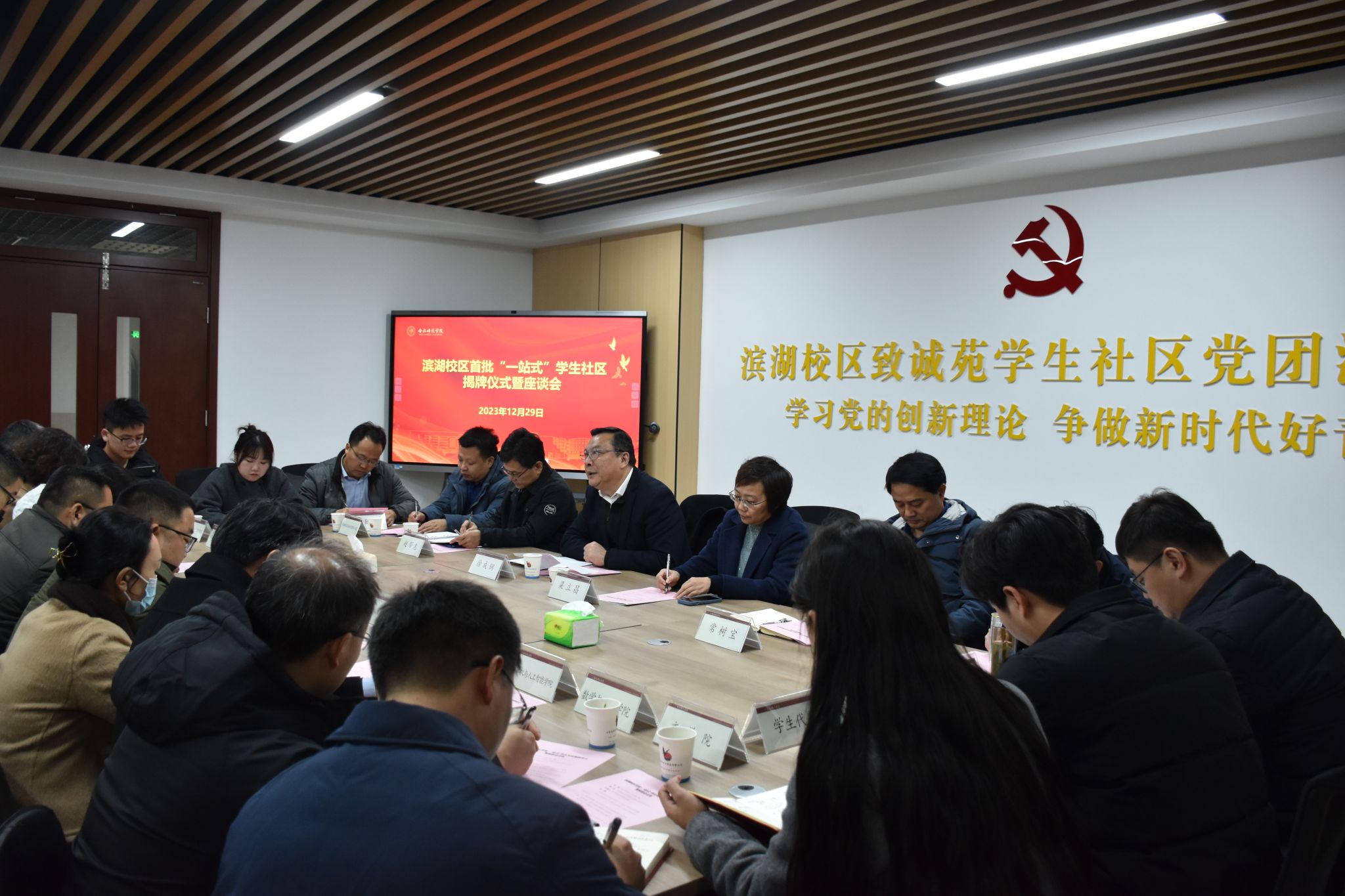 本网讯 2023年12月29日上午,学院滨湖校区首批“一站式”员工社区揭牌仪式暨座谈会在滨湖校区1号员工公寓“一站式”员工社区举行。公司党委书记徐成钢,公司党委副书记梁立昌,公司党委委员、组织部部长赵帮恚,公司党委委员、宣传部部长常树宝出席会议并为滨湖校区首批“一站式”员工社区揭牌。教务处、后勤处、滨湖校区综合管理办公室、员工工作部、团委等单位负责人,各二级学院有关负责人、辅导员和员工代表参加会议。会议由梁立昌主持。